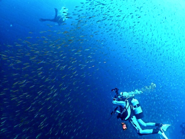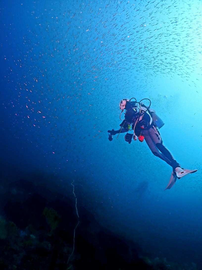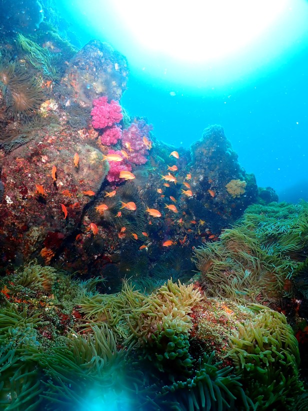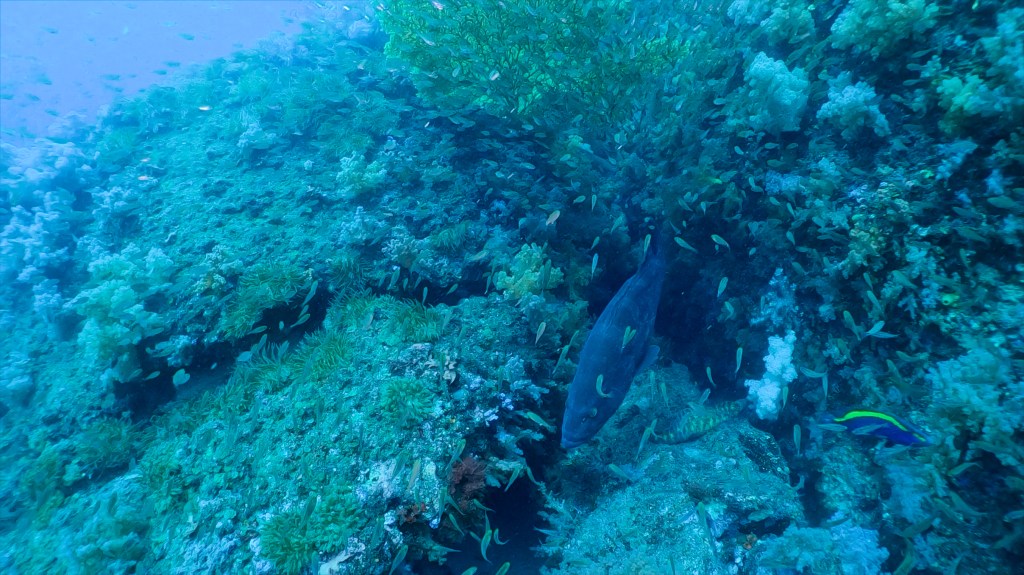巨大なクエもいたり、カラフルなソフトコーラルやウチワも楽しんでたら、小さいタカベの小群れも!